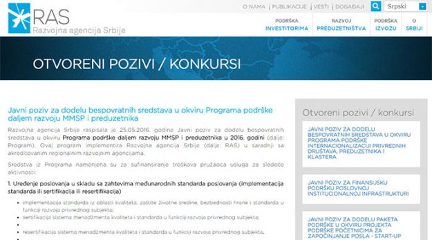 Развојна агенција Србије (РАС) расписала је јавни позив за учешће на Програму подршке пословној институционалној инфраструктури, намењеног сектору малих и средњих предузећа. Ово је један од 33 програма у оквиру Програма Владе Србије „Година предузетништва“, а право на подношење пројеката имају кластери, пословни инкубатори, научно-технолошки паркови, акредитоване регионалне развојне агенције, удружења, задруге, привредне коморе, као…