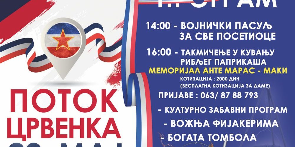 На излетишту „Поток“ код Црвенке у суботу, 29. маја, тринаести пут за редом биће организован традиционални програм поводом Дана младости. Посетиоци из кулске и околних општина, у организацији Туристичког удружења Црвенка и подршку Туристичке организације општине Кула биће у прилици да прославе Дан младости уз богат спортско-забавни програм, међу којима је и Меморијал „Анте Марас Маки“ такмичење у кувању рибљег паприкаша, вожња фијакером, богата томбола, а за све посетиоце је обезбеђен војнички пасуљ.