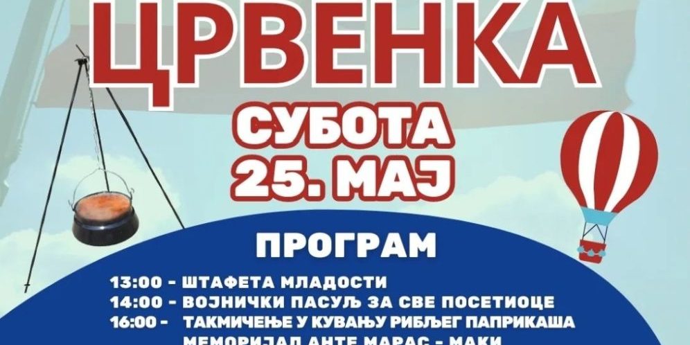 Туристичко удружење Црвенка у суботу, 25. маја, на излетишту ,,Поток“ организује обележавање Дана младости које ће се одржати по следећем распореду: од 13 часова Штафета младости, од 14 часова војнички пасуљ за све посетиоце и од 16 часова такмичење у кувању рибљег паприкаша и Меморијал ,,Анте Марас Маки“. Котизација износи 3000 динара, а можете се пријавити позивом на број телефона 063/8788-793.
