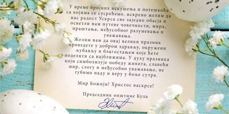 Поводом предстојећег Ускрса, председник општине Кула Дамјан Миљанић упутио је честитку верницима који овај празник обележавају по јулијанском календару.